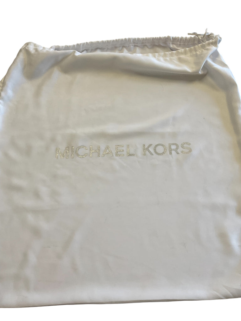 The interior, fully lined with tonal MK monogram fabric, features generous zip compartments and slip pockets — a true blend of beauty and utility. Still with original tags and protective wrappings, this piece remains unworn and pristine.
