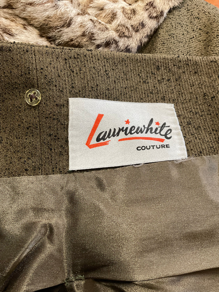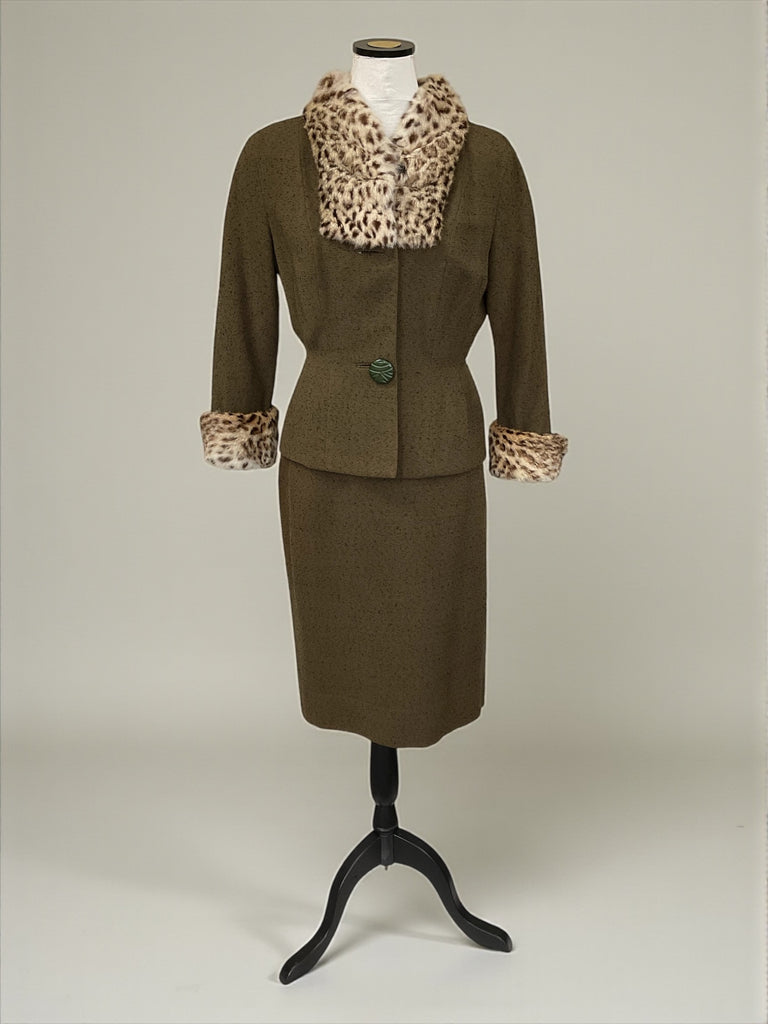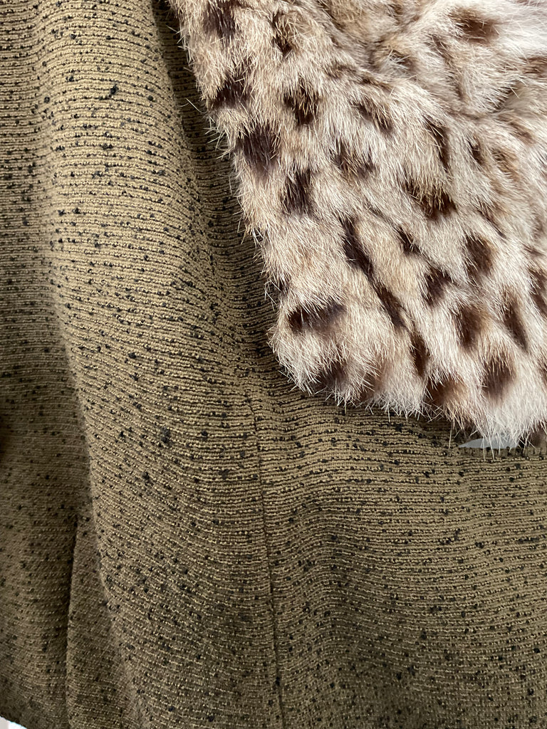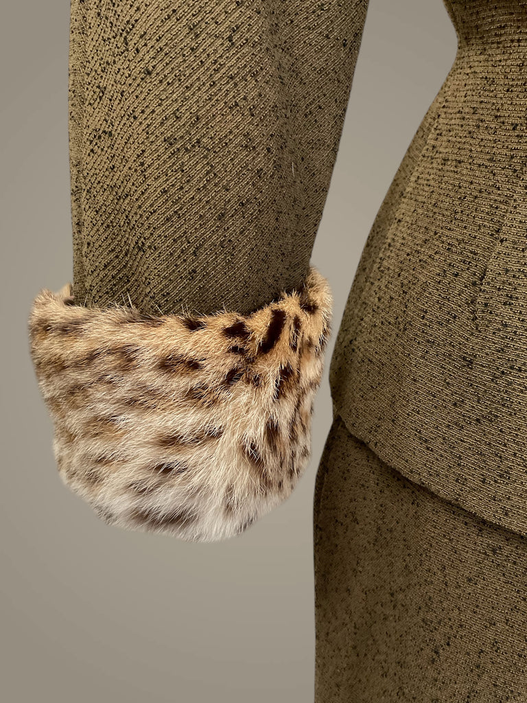 A beautifully preserved example of post-war couture, combining precision tailoring with the opulent use of ocelot fur — a hallmark of luxury fashion in the 1950s.