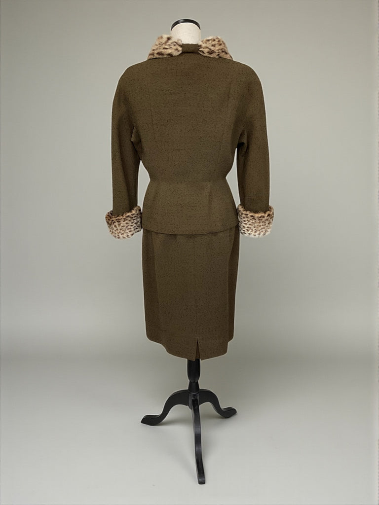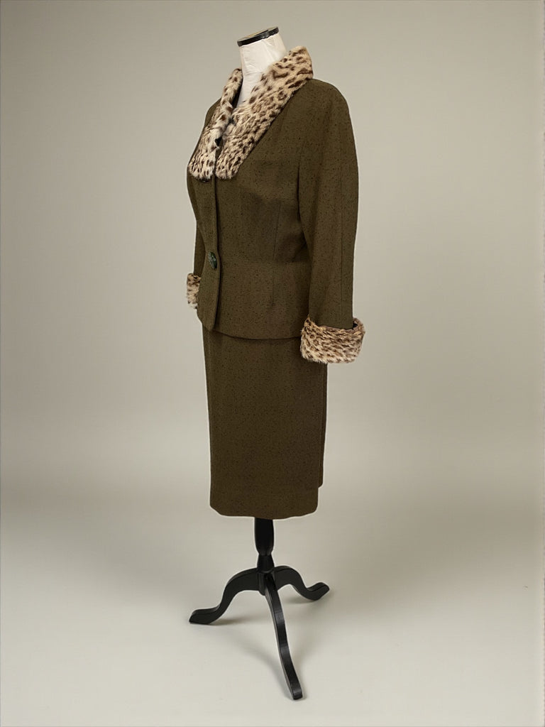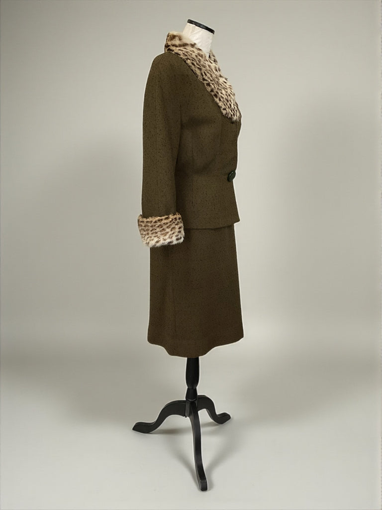 Circa 1950sAn exceptionally elegant mid-century couture two-piece suit, comprising a fitted jacket and matching pencil skirt, crafted in olive wool crepe. The jacket features a sharply tailored waist, sculpted shoulders, and a single decorative button fastening. The collar and turned-back cuffs are trimmed with genuine ocelot fur — a luxurious and highly fashionable detail of the period, reserved for couture houses and elite private clients.