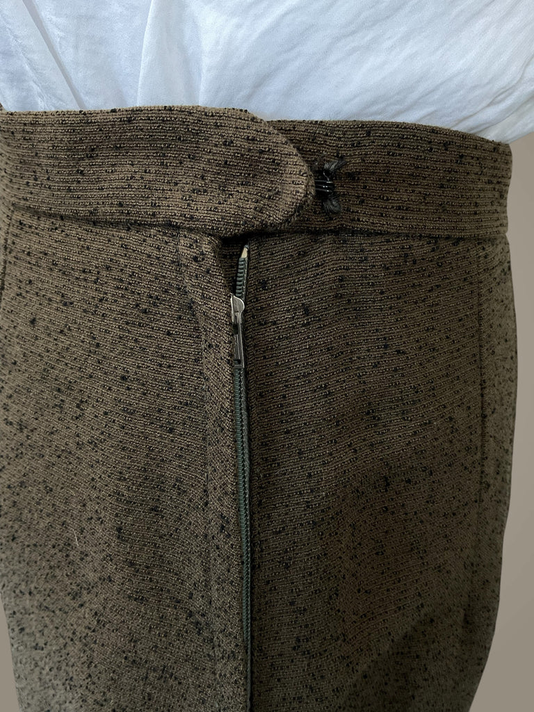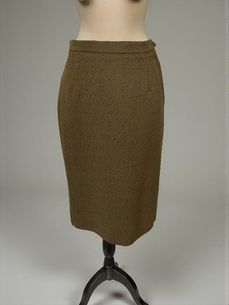 The skirt follows a classic narrow silhouette, cut to flatter the line of the body while maintaining the refined restraint characteristic of 1950s British couture.