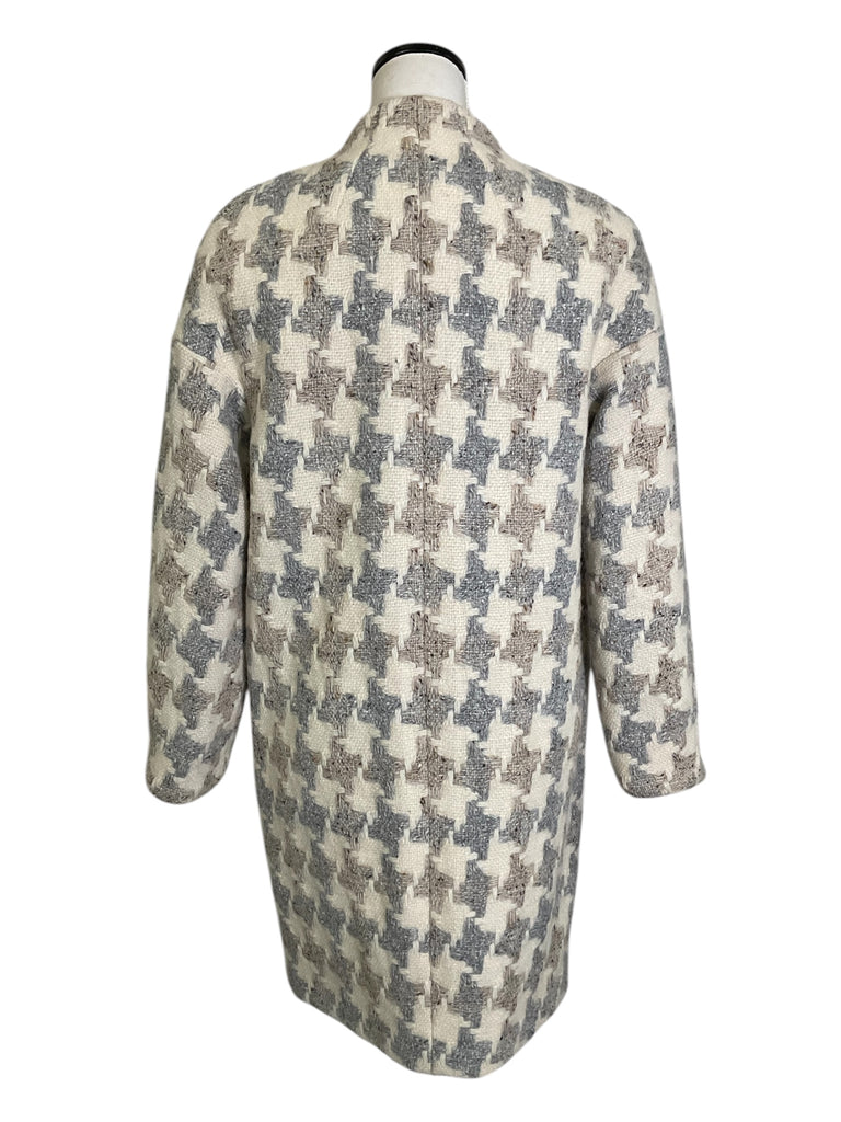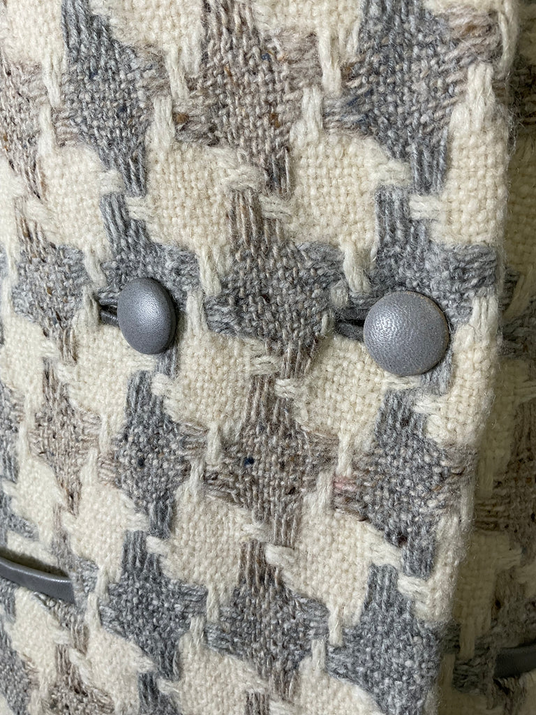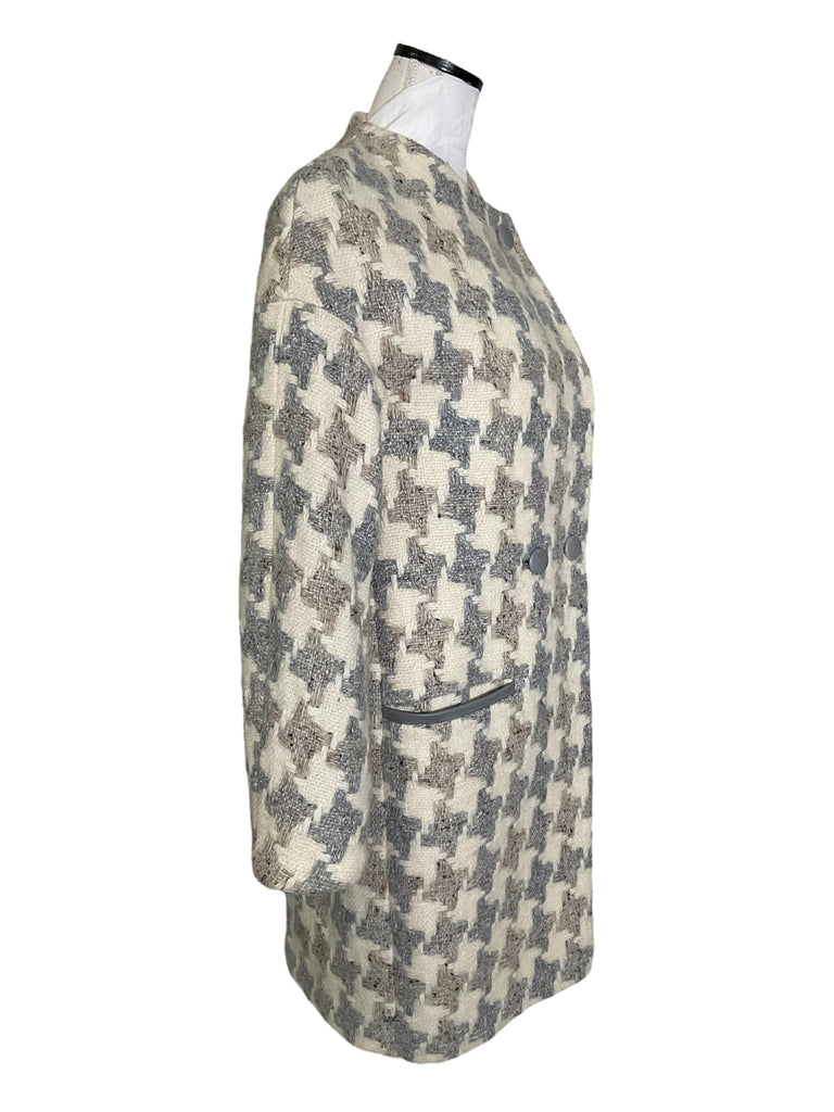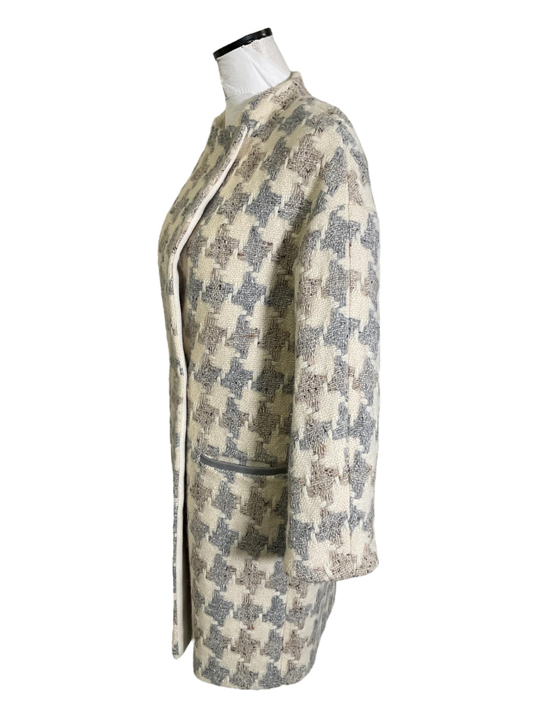 A beautifully structured vintage Jaeger coat crafted in a luxurious 100% wool weave featuring an oversized houndstooth check in soft cream, grey, and taupe tones. The silhouette is elegant and streamlined, designed with a refined collarless neckline and a double-breasted front finished with leather-covered buttons. Matching leather piping trims the front pockets, adding a subtle touch of sophistication.