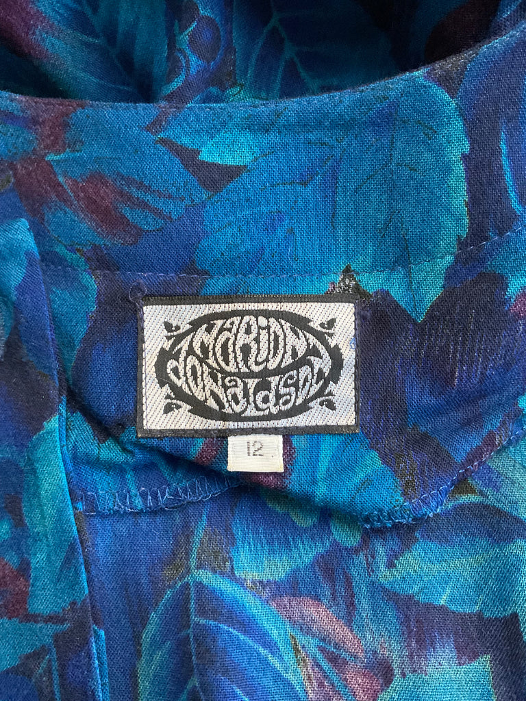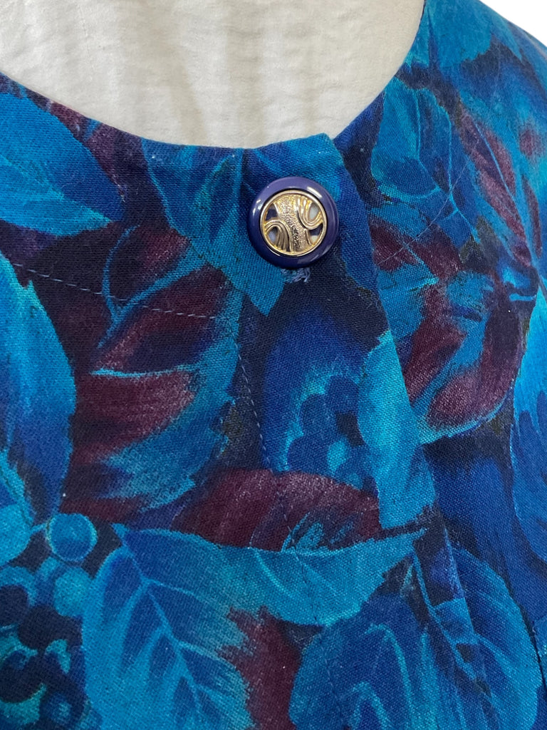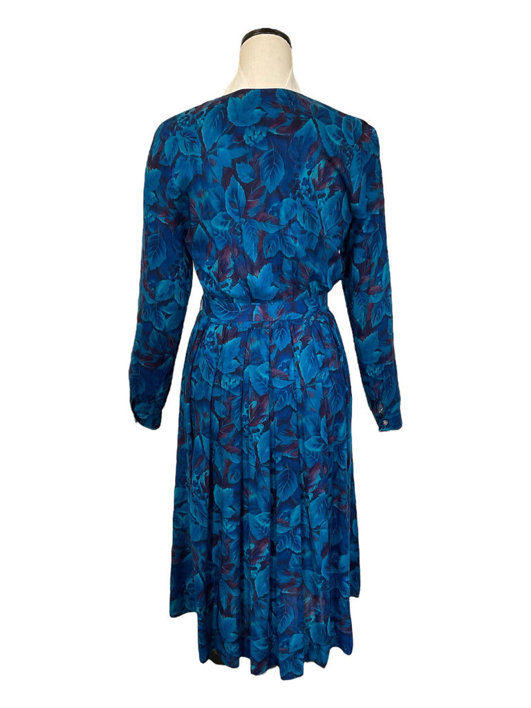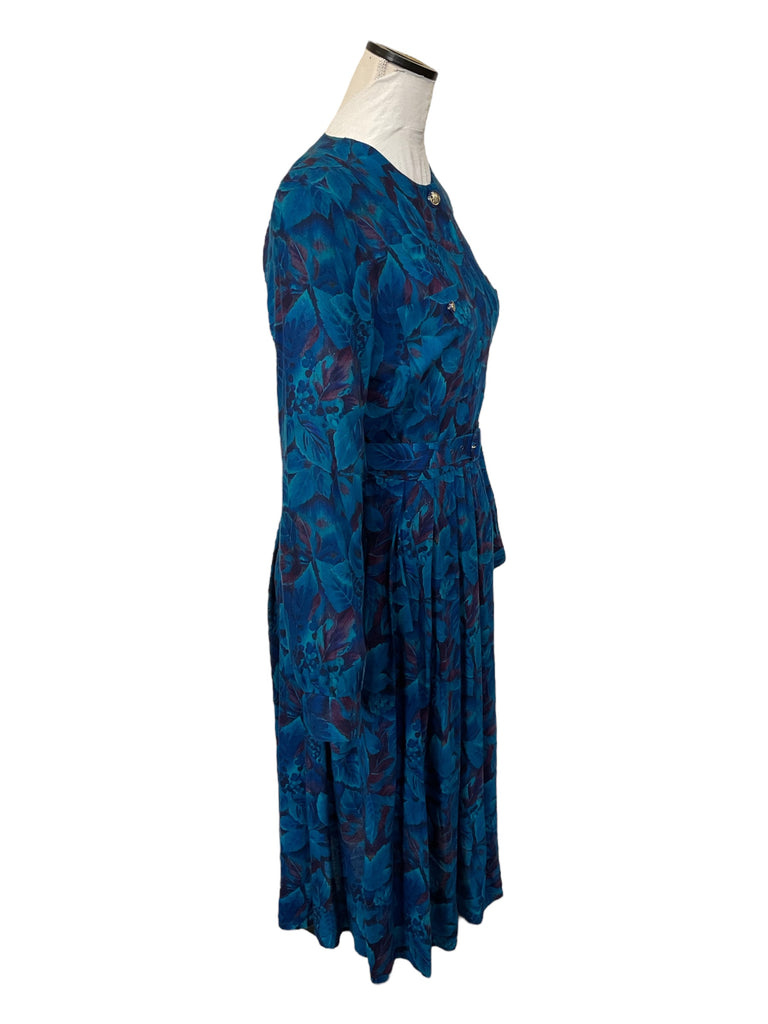 A beautiful long sleeve floral blue and purple Marion Donaldson belted tea dress with gold featured buttons from the 1980s.