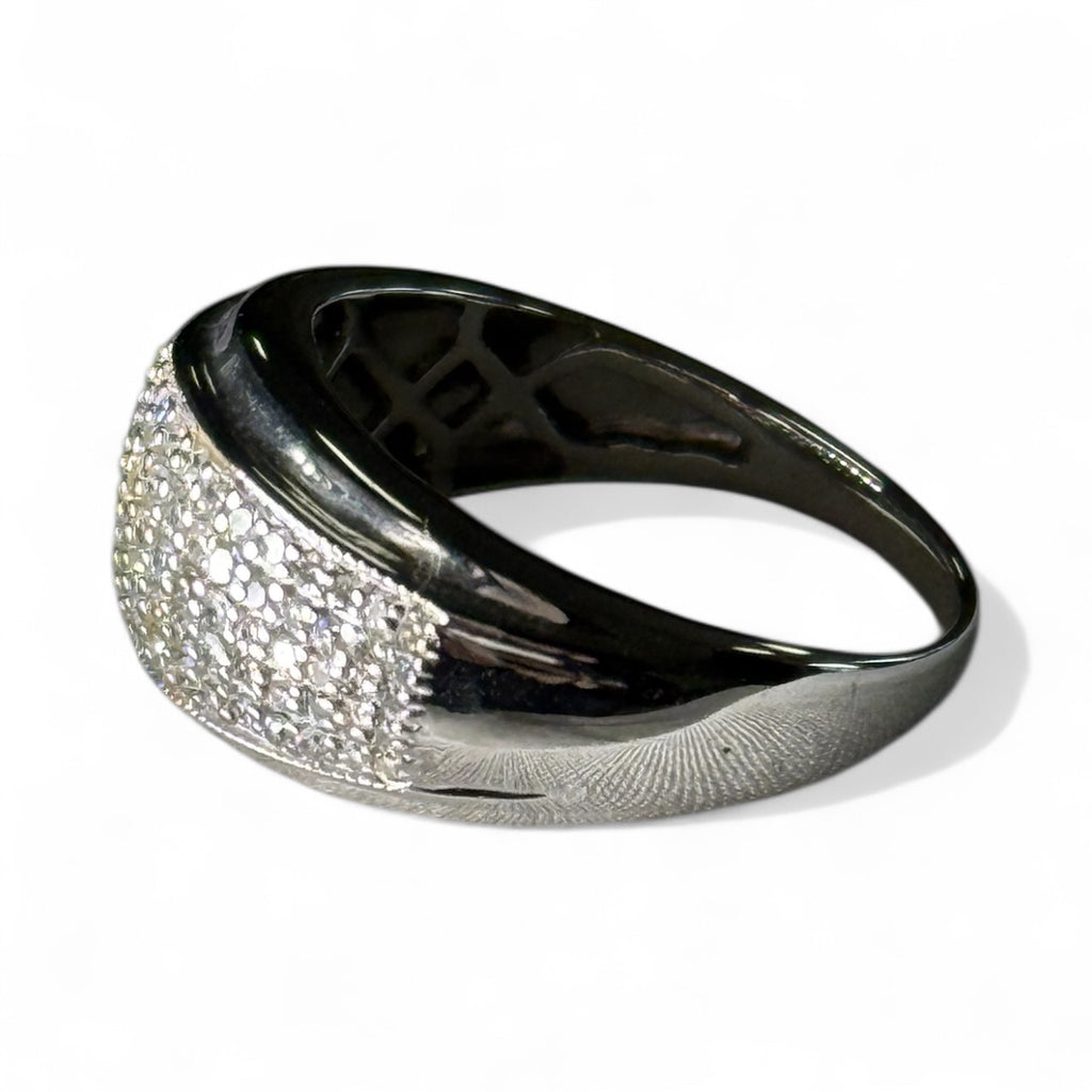 A sophisticated 18K white gold ring, meticulously set with five rows of pavé-set brilliant-cut diamonds that create a dazzling, light-catching surface. The cluster-style setting maximises sparkle and elegance, offering a refined statement for both day and evening wear.