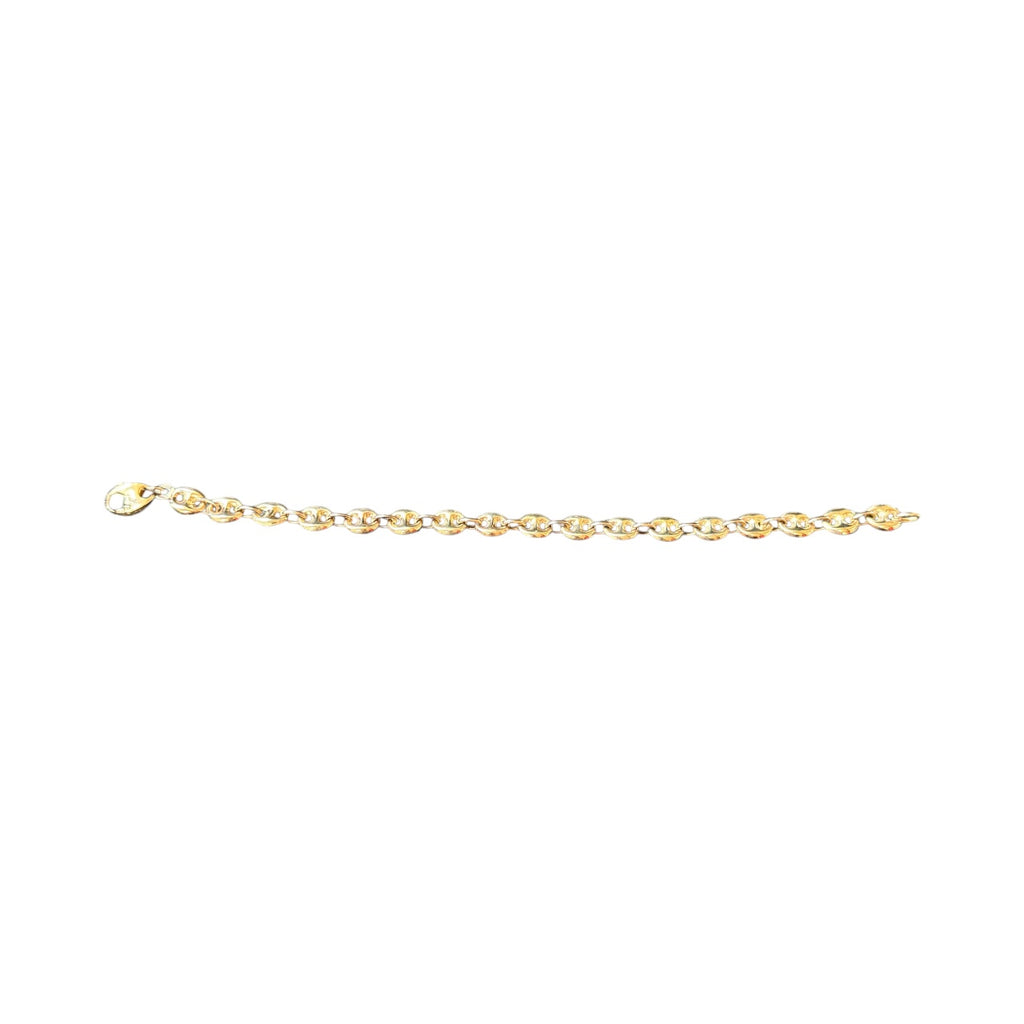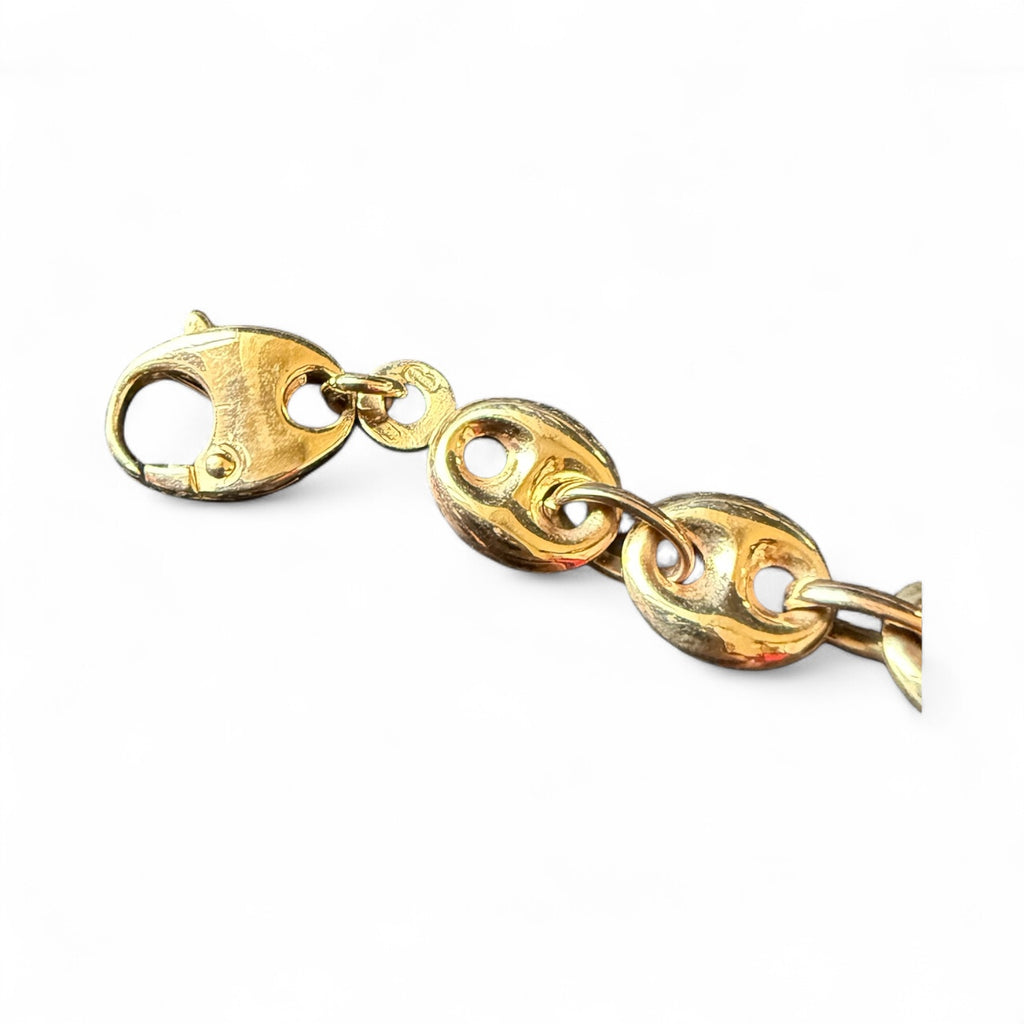 A classic 9K yellow gold Marine Anchor bracelet, crafted with interlocking nautical-inspired links that capture timeless elegance and everyday wearability. Weighing 6.9 grams, this beautifully polished bracelet offers both strength and sophistication, making it an ideal choice for layering or wearing alone as a statement of understated luxury.