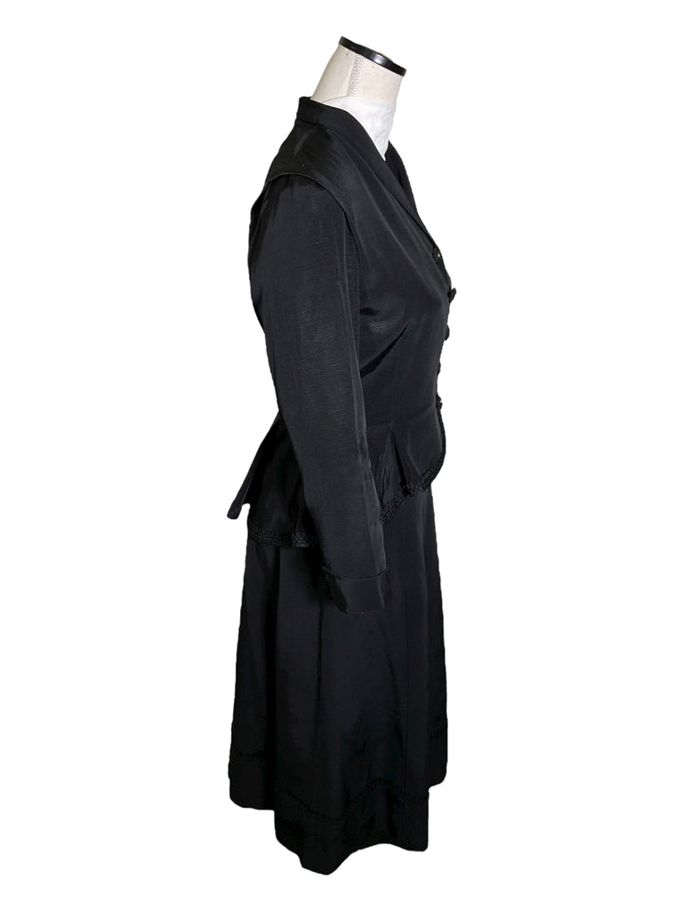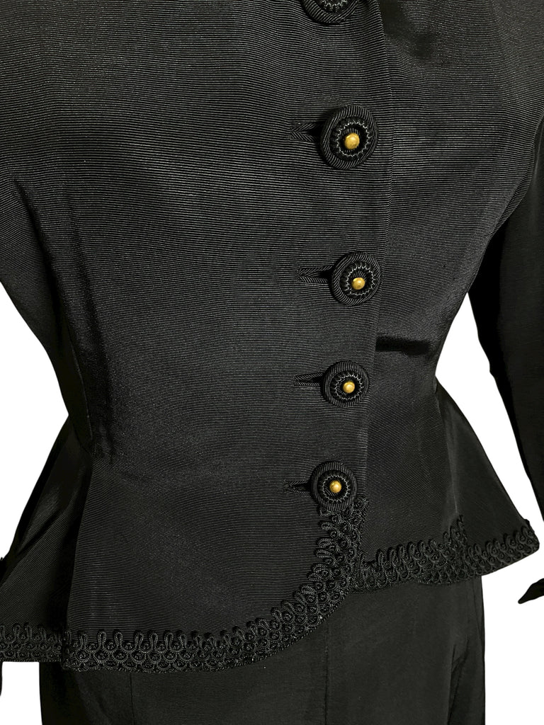 An original late-1940s ladies’ black formal skirt suit of historical significance, tailor-made in luxurious grosgrain fabric. This exquisite ensemble embodies the defining aesthetic of the “New Look” era, with its sculpted nipped-in waist, structured shoulders, and softly flared peplum jacket — the silhouette that redefined post-war femininity.