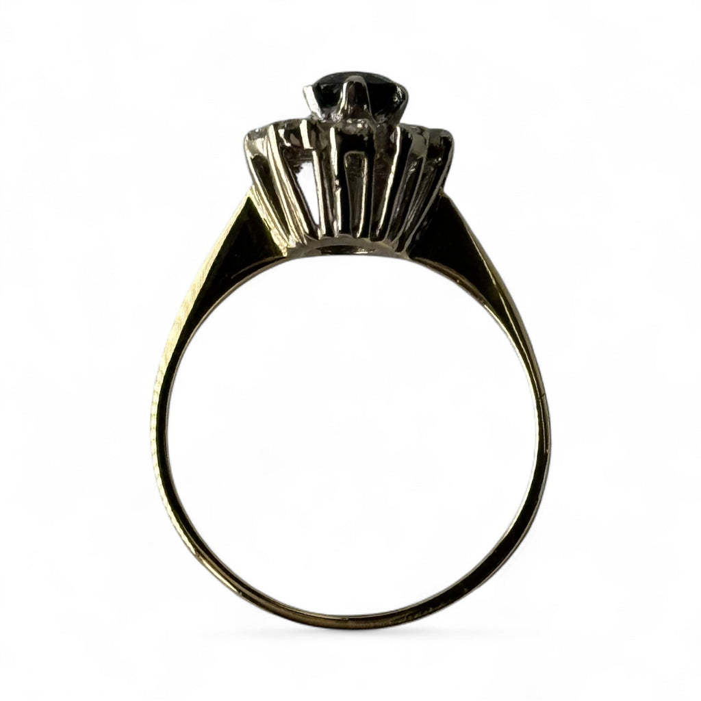 - Gemstones: 1 x brilliant-cut blue sapphire (centre), surrounded by small brilliant-cut diamonds