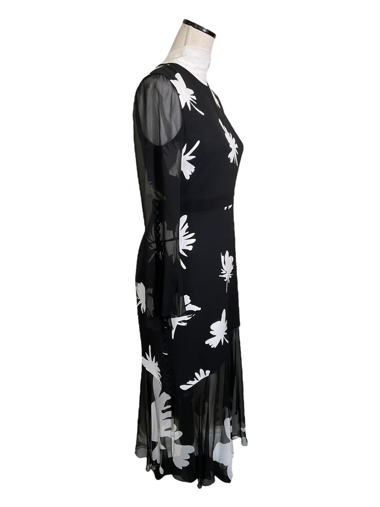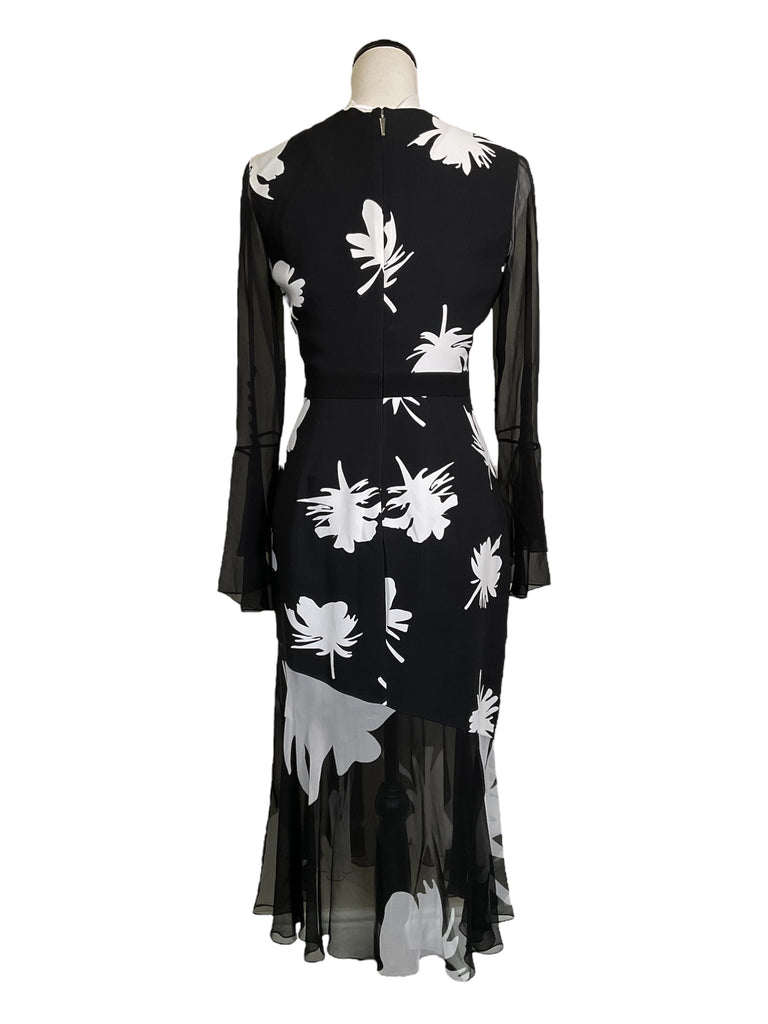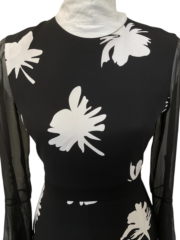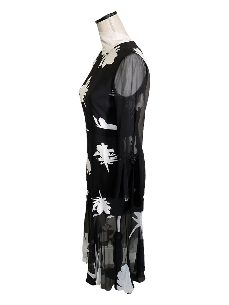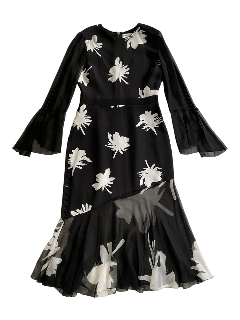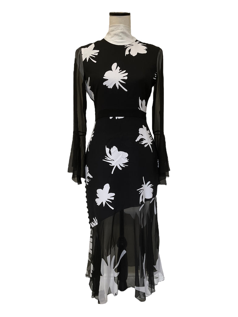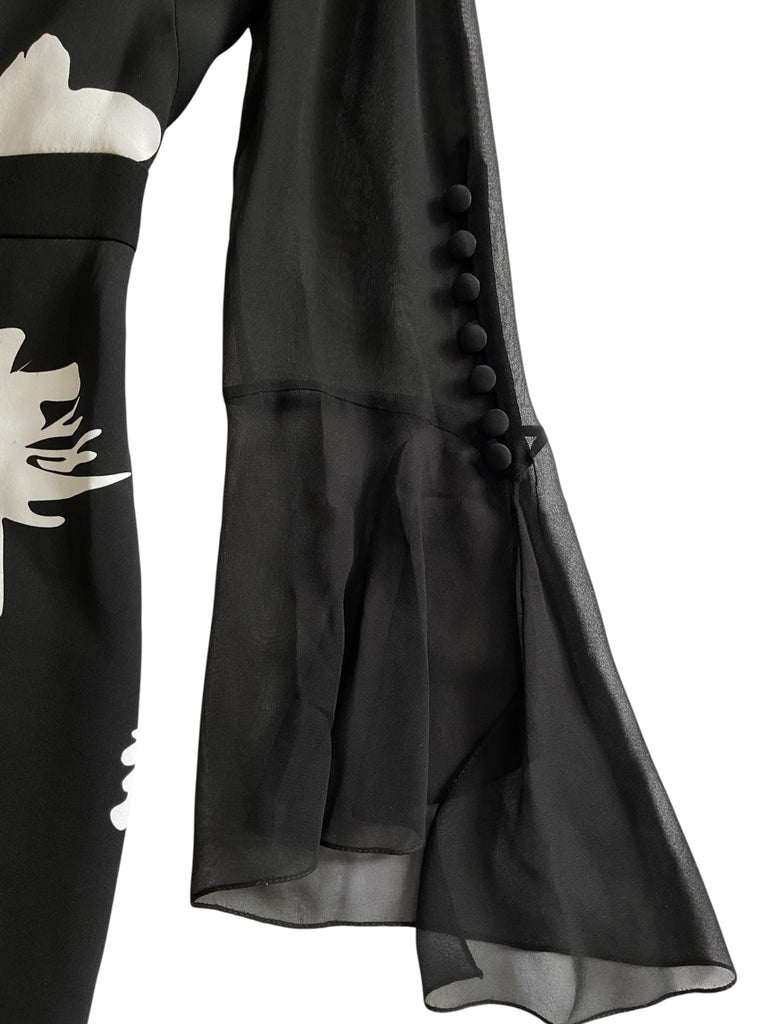 Rendered in bold monochrome florals, the design features a fitted bodice and defined waist that flows into a gently flared, asymmetric skirt with sheer panel inserts — a technique Gurung often used to create movement and architectural fluidity. The long sheer sleeves, finished with couture-style covered buttons, echo the soft structural contrasts for which the designer is known.