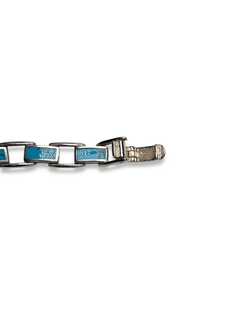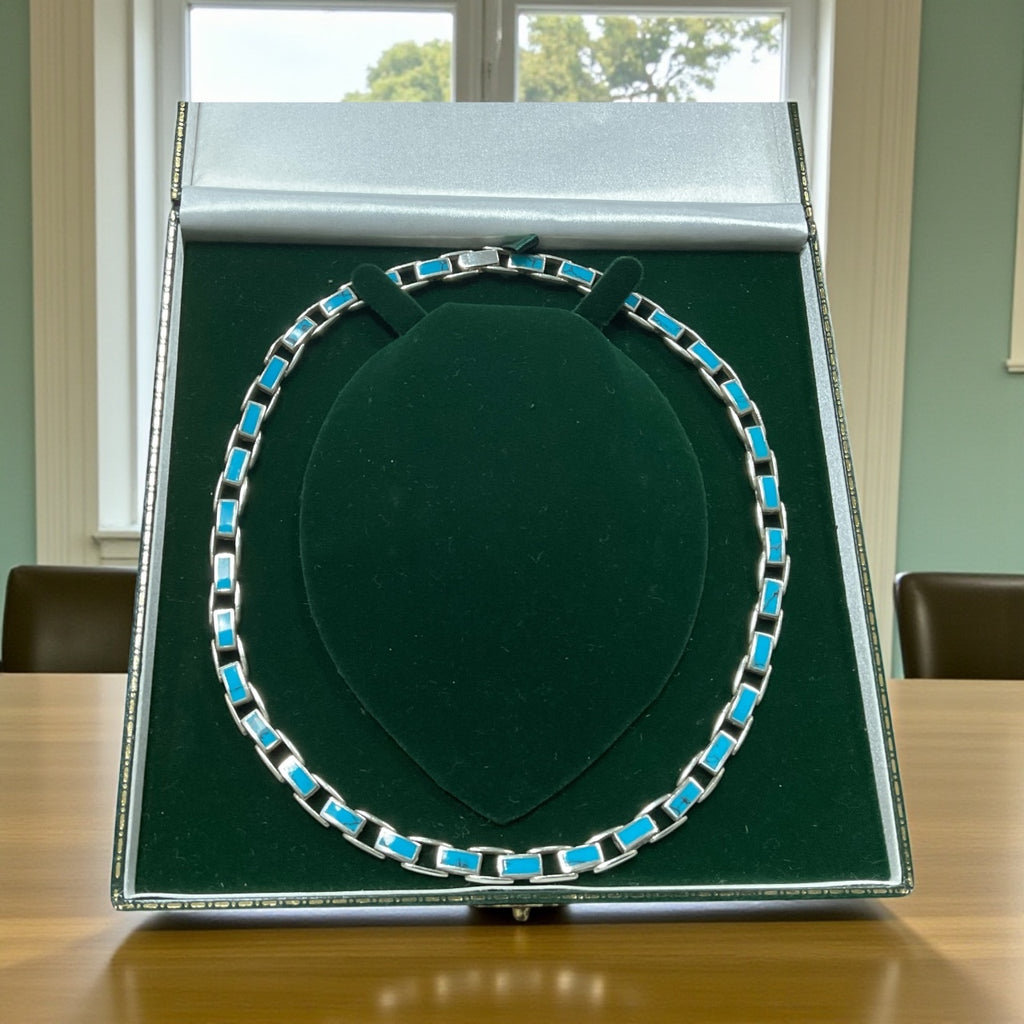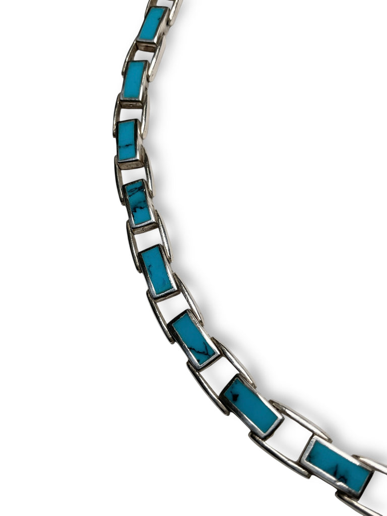 A beautifully handcrafted sterling silver necklace composed of articulated rectangular links, each individually set with a hand-cut turquoise inlay. The refined construction, fluid movement and precision of the inlay work reflect the artisanal silversmithing traditions of the Southwestern United States—most closely associated with Zuni and Navajo jewellers of the 1970s and 1980s.