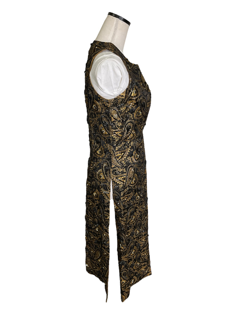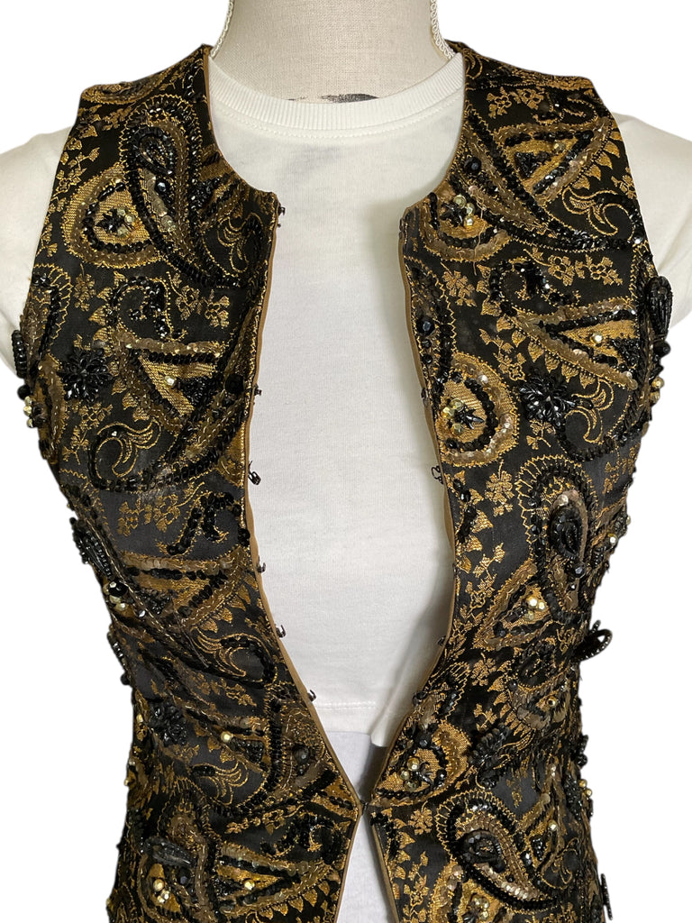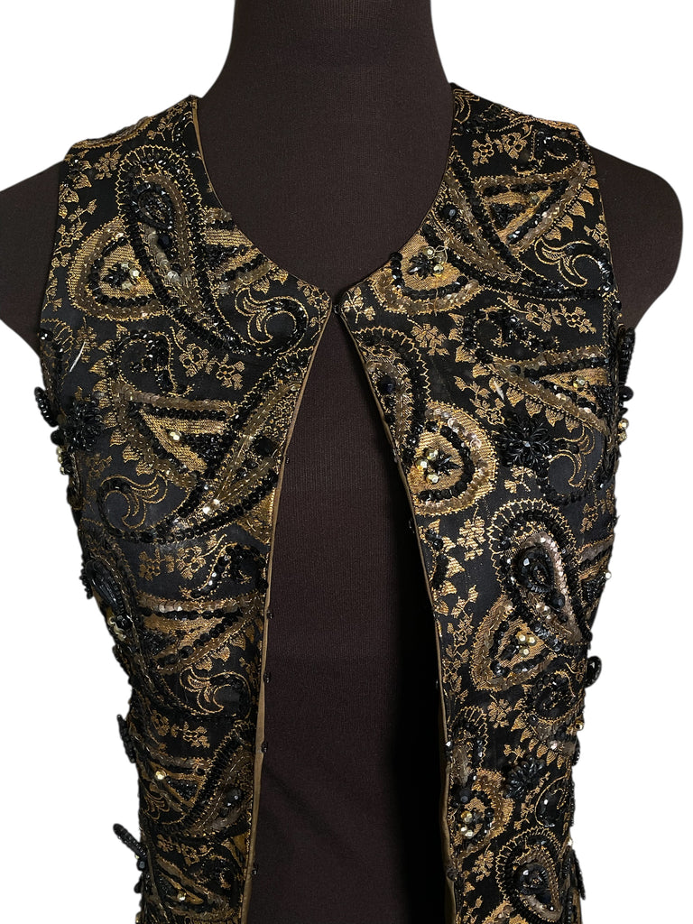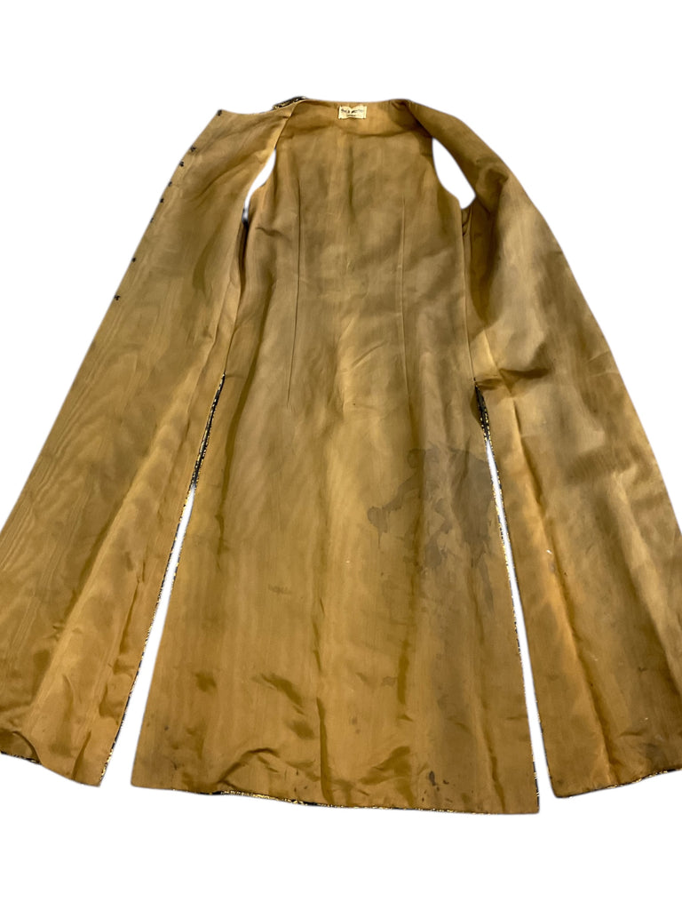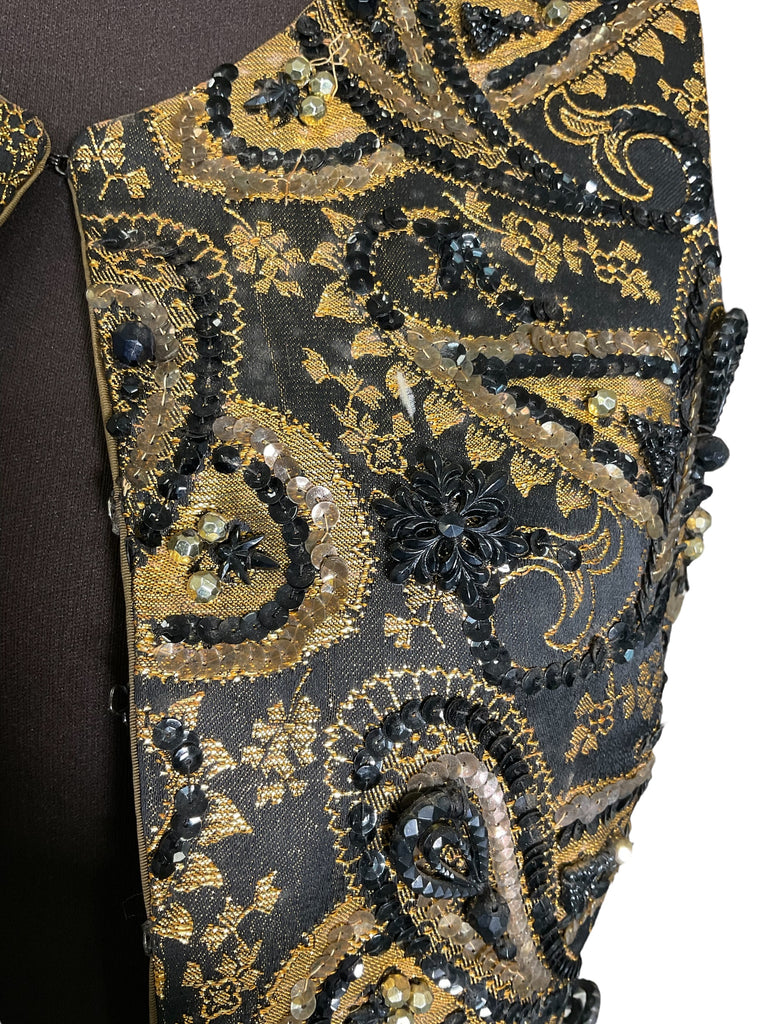 Thea Porter London Early 1970s Gold & Black Brocade Sleeveless Evening Coat | Vintage Embellished Bohemian Couture
