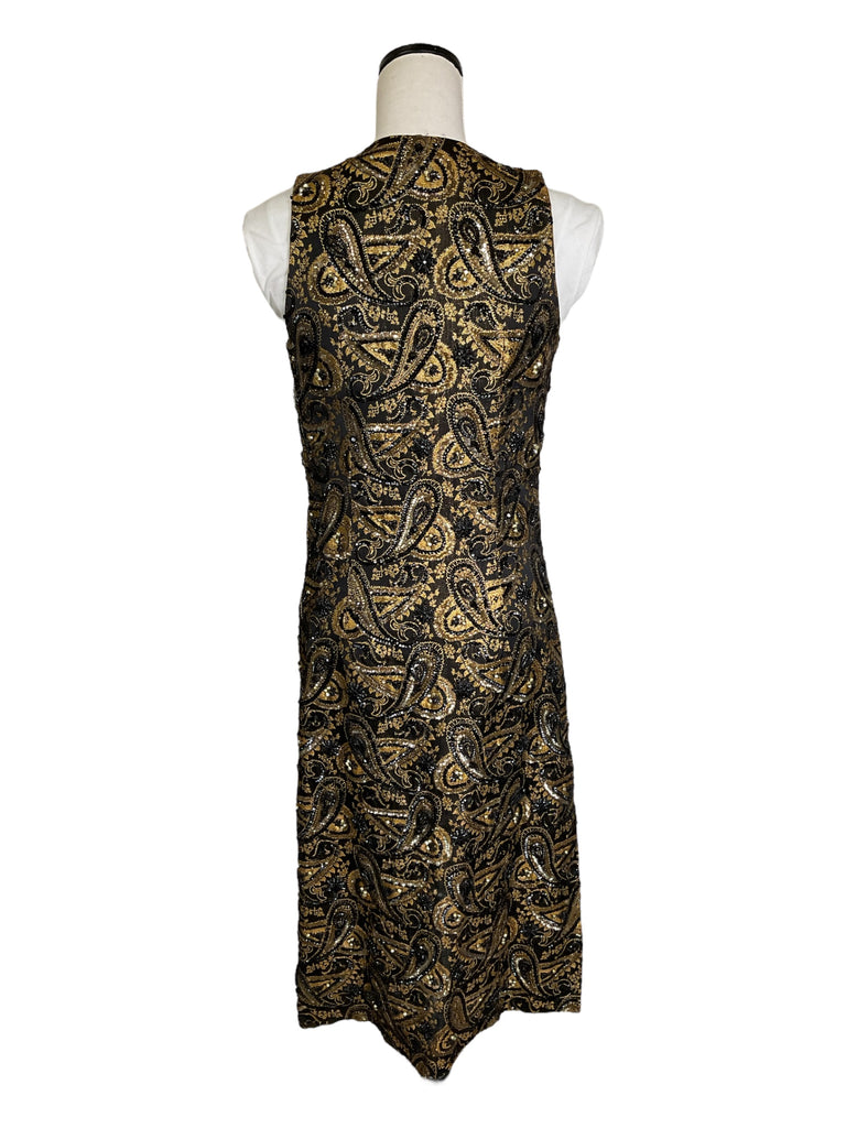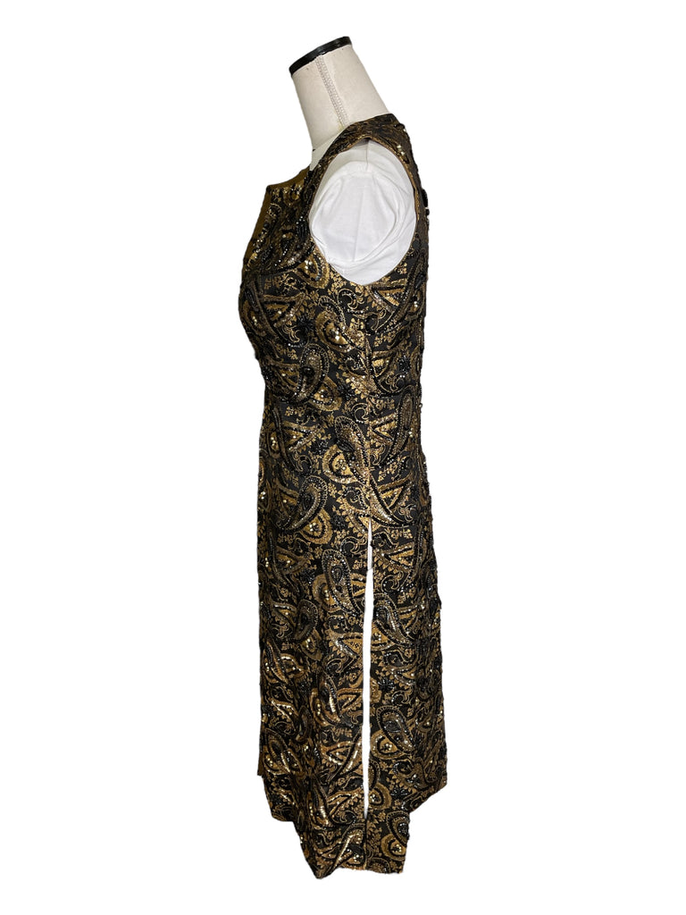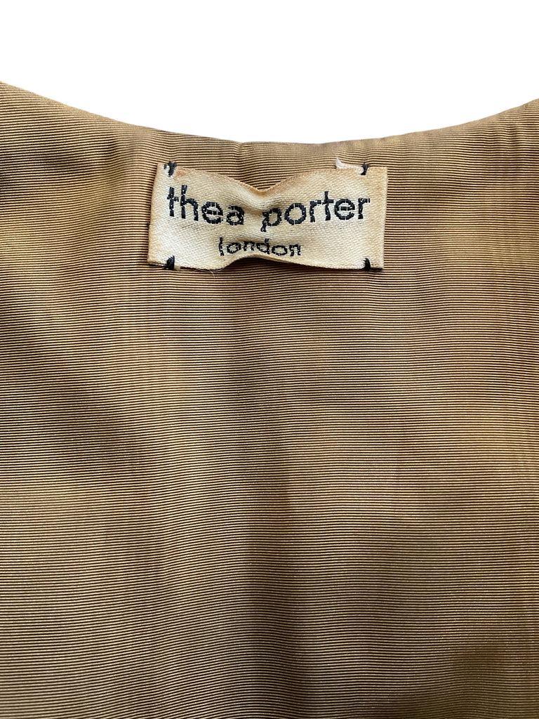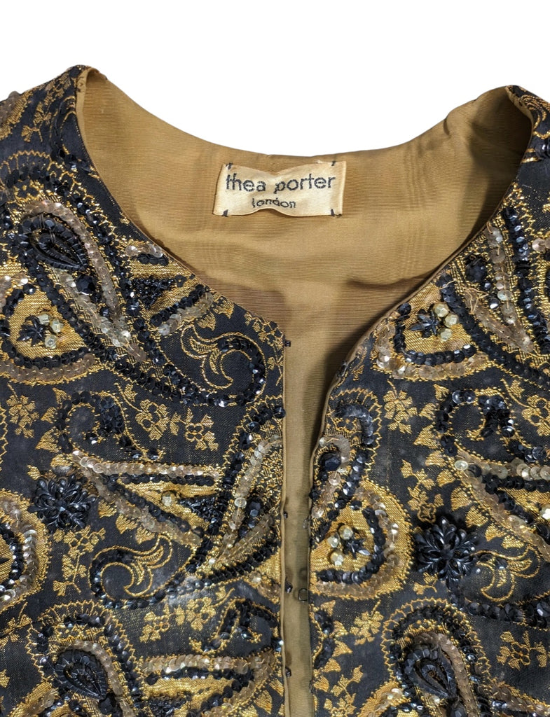 Fashioned from richly woven black and gold brocade with a detailed paisley motif, the piece is elevated by hand-applied sequins, beads, and metallic embroidery — hallmarks of Thea Porter’s couture-level craftsmanship. Fully lined in golden silk chiffon, the coat fastens with discreet hooks at the bodice before falling open in Porter’s signature fluid silhouette.