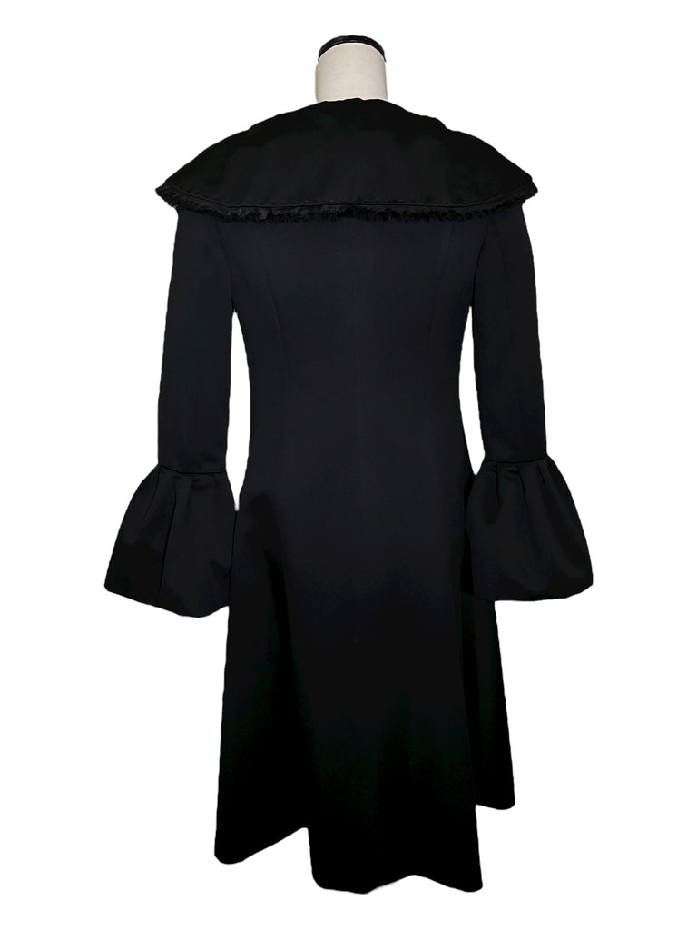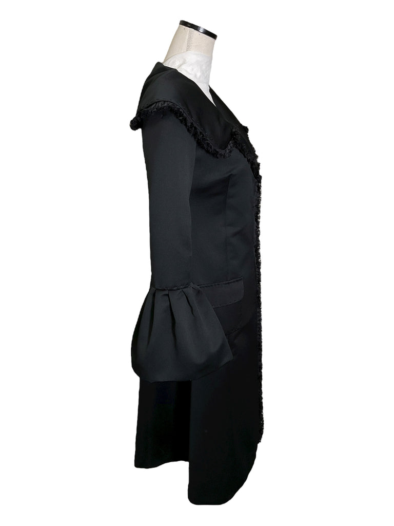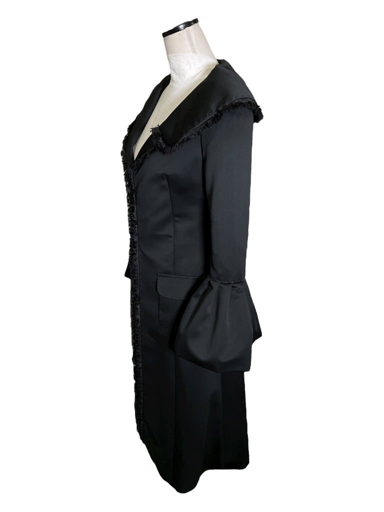 This exceptional black satin-backed crepe coat by Tomasz Starzewski represents the height of 1990s British couture. Tailored with sculptural precision, it features a dramatic flared collar edged in tonal trim, voluminous balloon sleeves, and a sleek concealed fastening that enhances its long, fluid line.